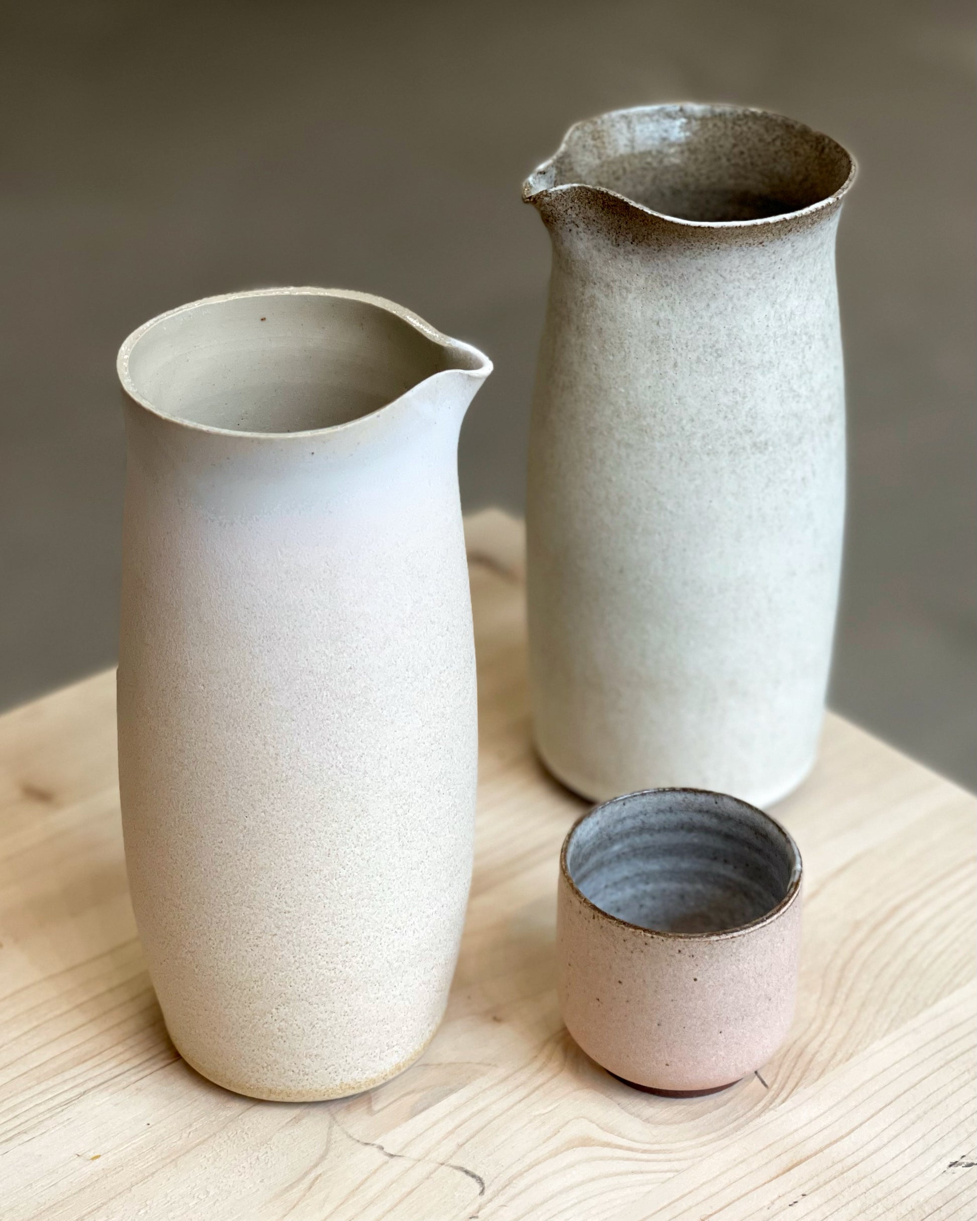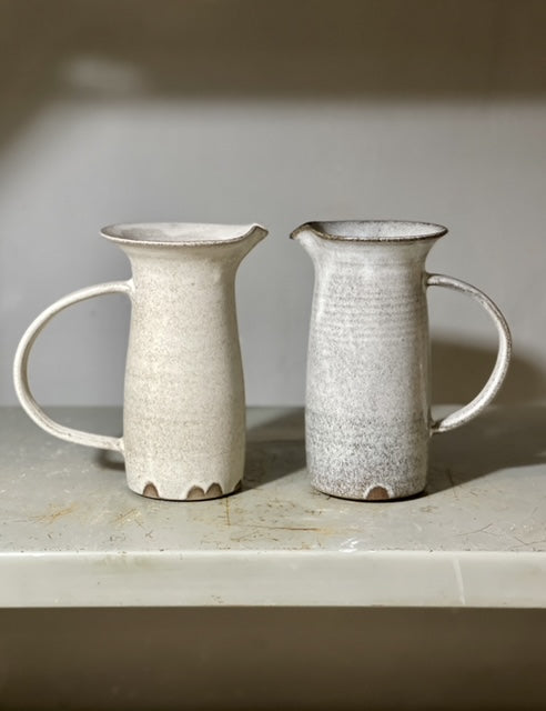 Pitchers with a small spout, wide collar and handle.