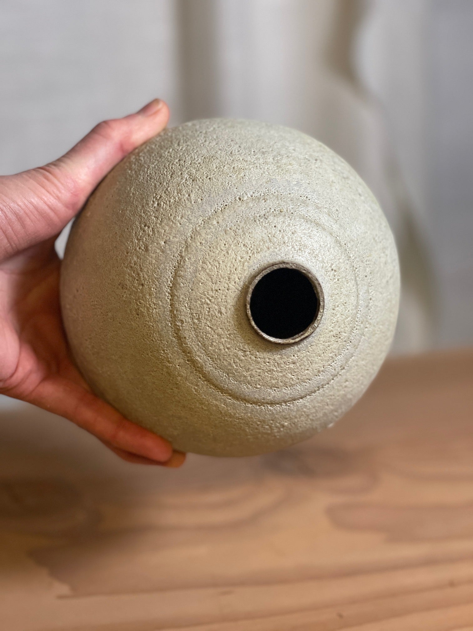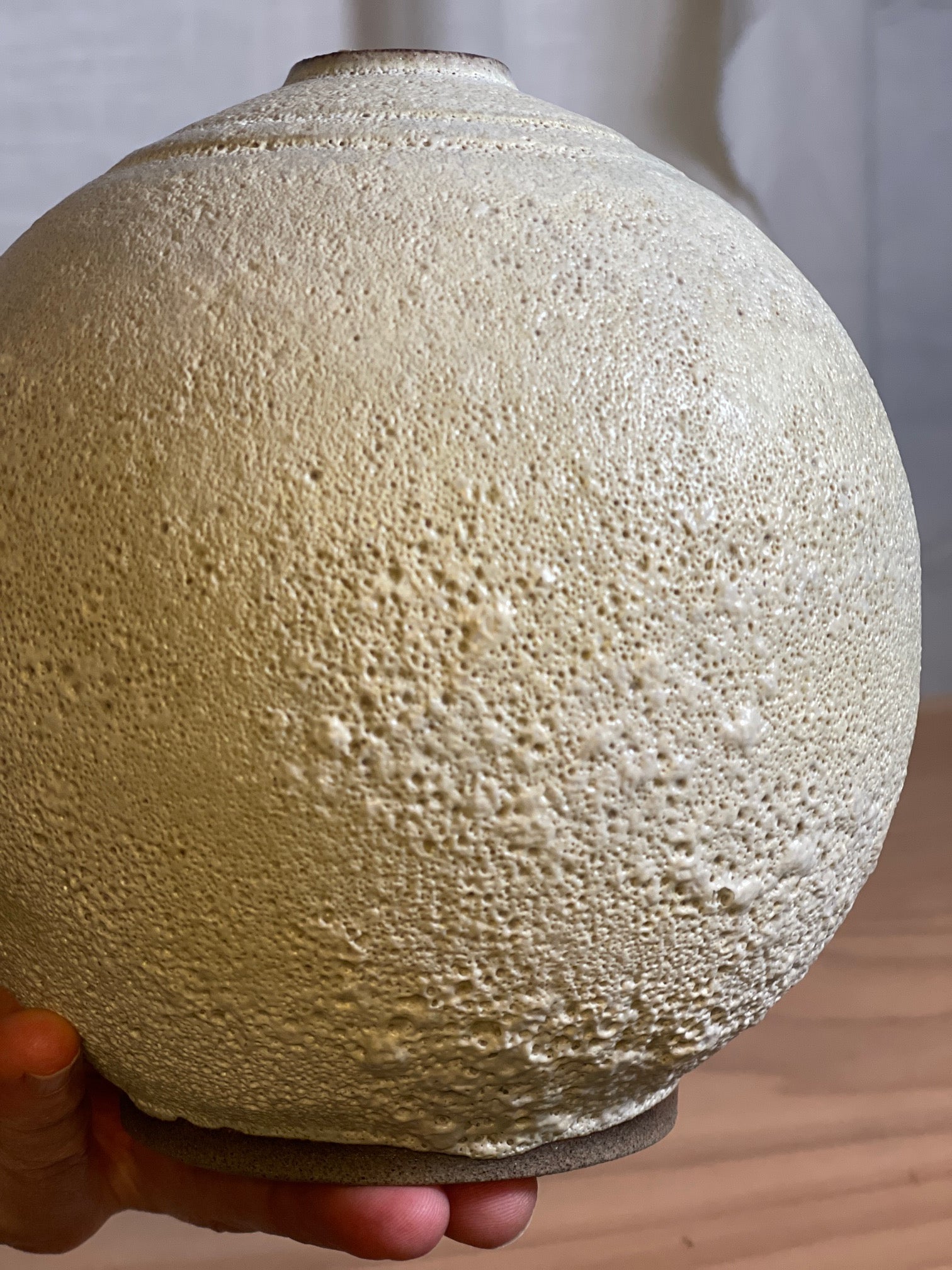 This vase is glazed with a glaze with a special texture that makes the surface slightly coral-like. The colors are light gray white, with a faint yellow tinge.