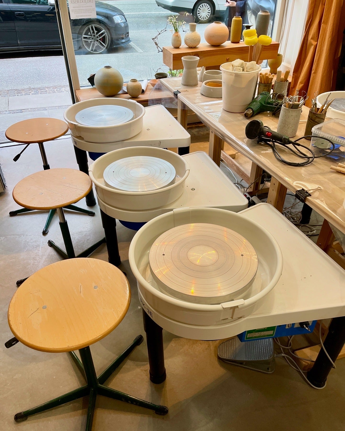 Cleaning is a given in a ceramics workshop. That's why we stop about 1/2 hour before to get everything cleaned and tidied up together. Everyone helps each other.