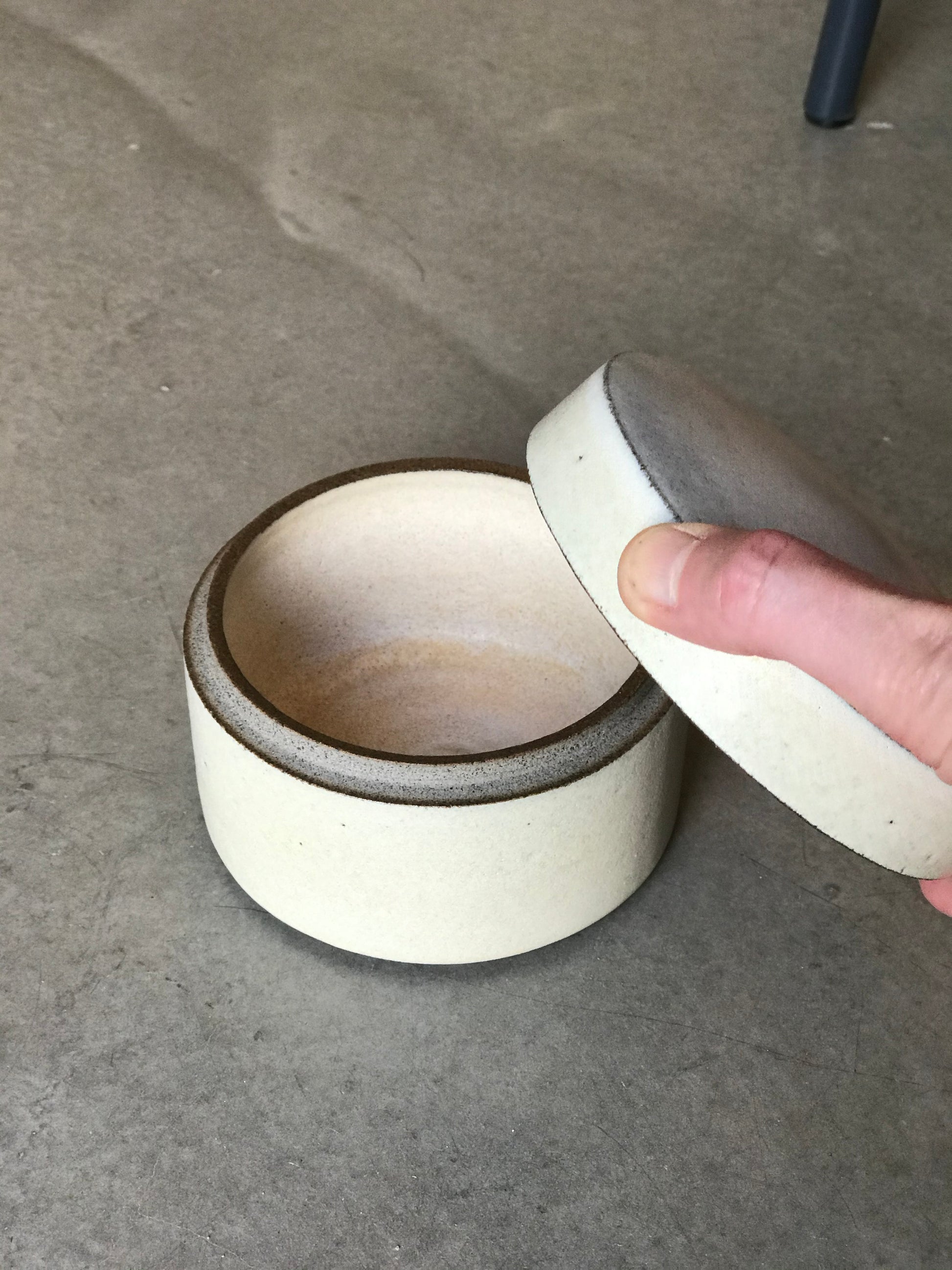 Den er drejet i én sammenhængende form, skåret op og trimmet så de to dele passer sammen. Alt dette udføres i hånden, hvilket betyder, at ikke to er ens. Hverken i form eller overflade.