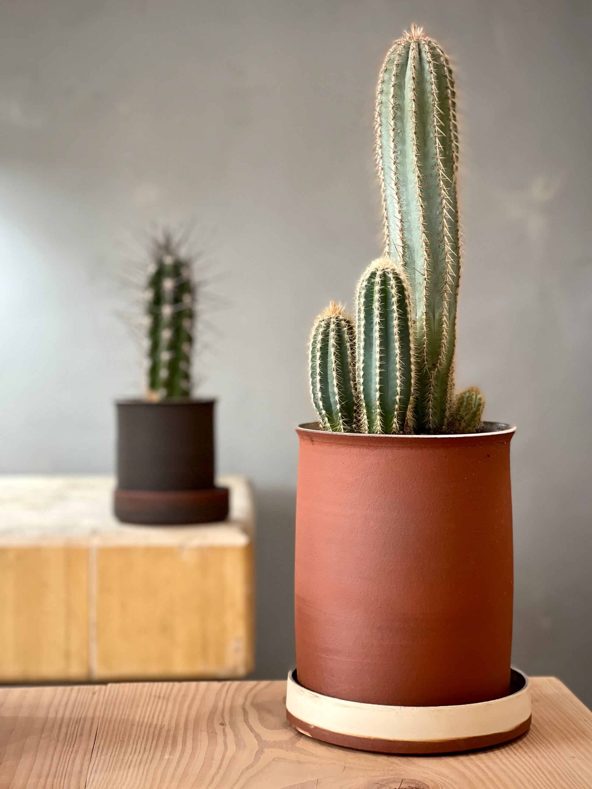 Hvis potten er uglaseret er underskålen som minimum glaseret på indersiden, for at undgå gennemtrængning af fugt. Underskålene er formgivet ret store i forhold til mange andre. Det er et valg fra min side, fordi jeg godt kan lide at man kan vande krævende planter, uden at vandet løber over. Og fordi jeg gerne vil have at underskålen er en ligestillet del af formgivning af de to dele i sammenhæng.