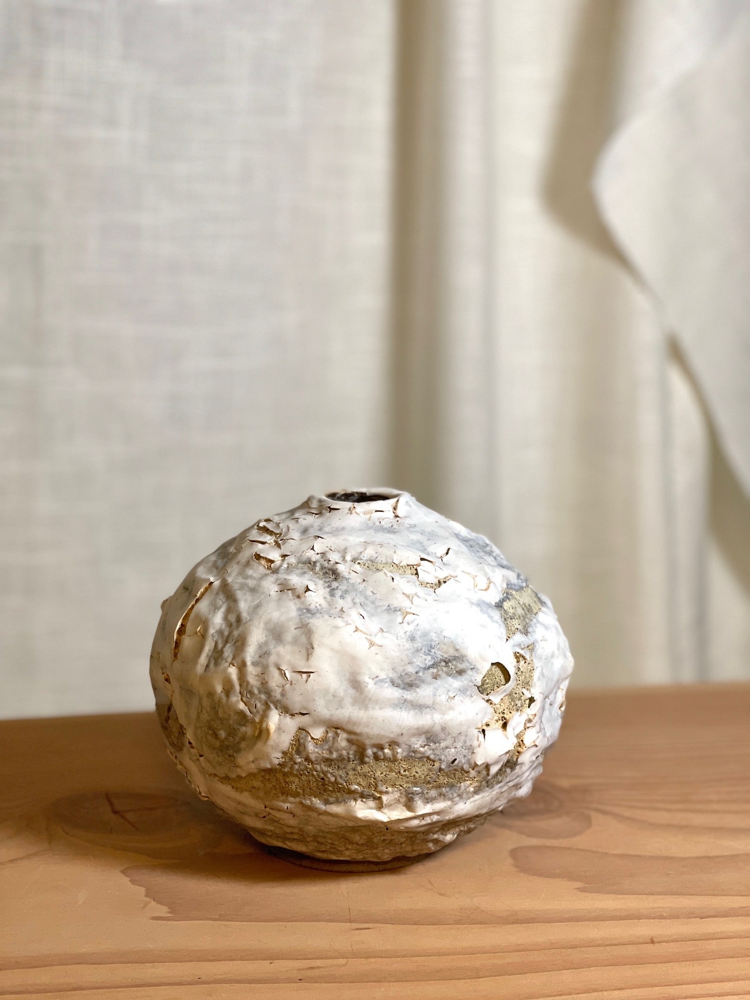 Denne særlige unika vase har en tekstureret, krakelleret overflade. Farverne er hvide fra et lag af porcelæn og et underliggende gyldent lag af krater glasur, der ses i krakelleringerne.