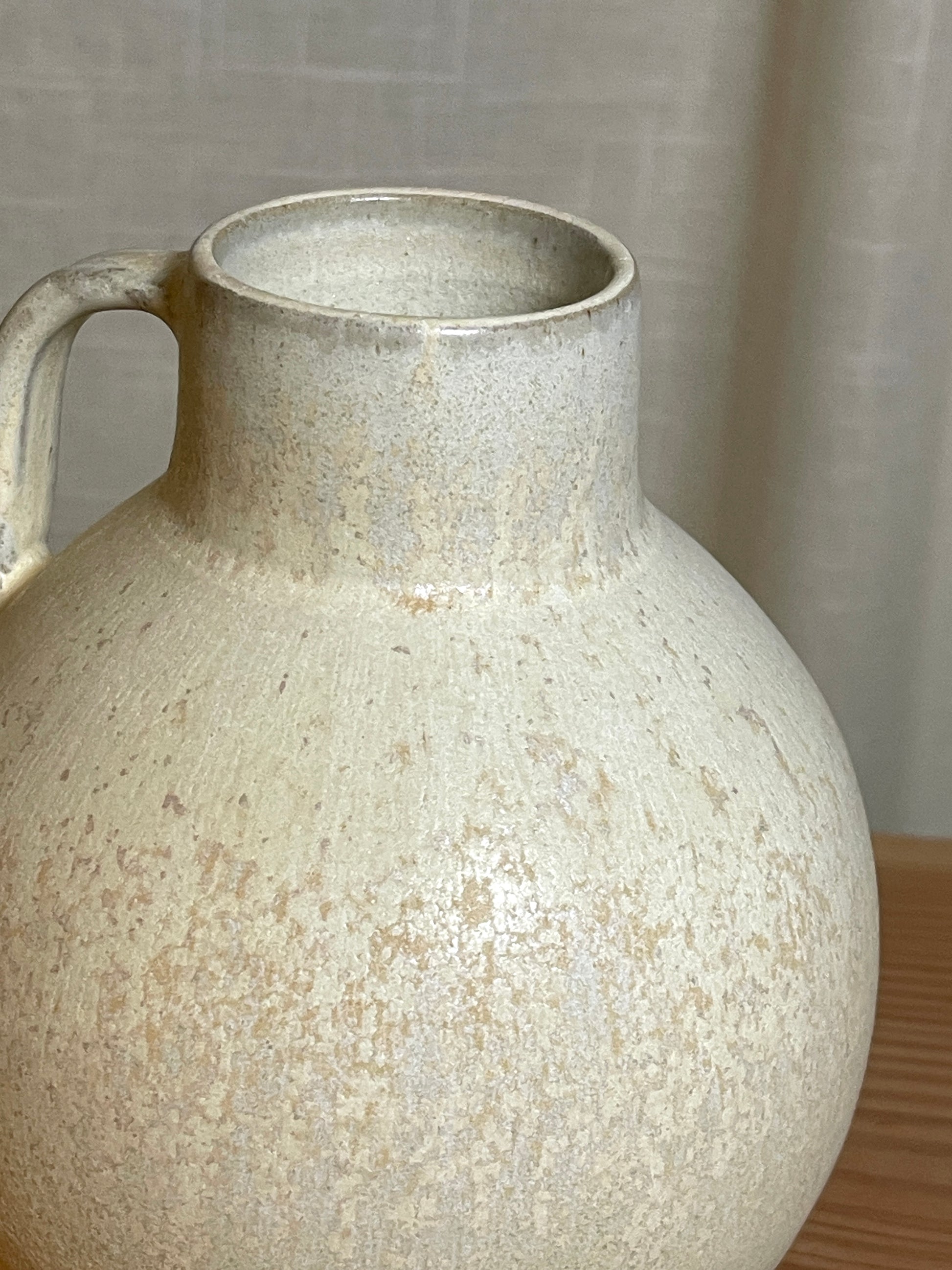 Denne særlige vase er glaseret med en mat krystal glasur, som laver de fineste små lysegrå krystaller. Glasuren har en varieret tekstur og trækker sig fra kanterne.