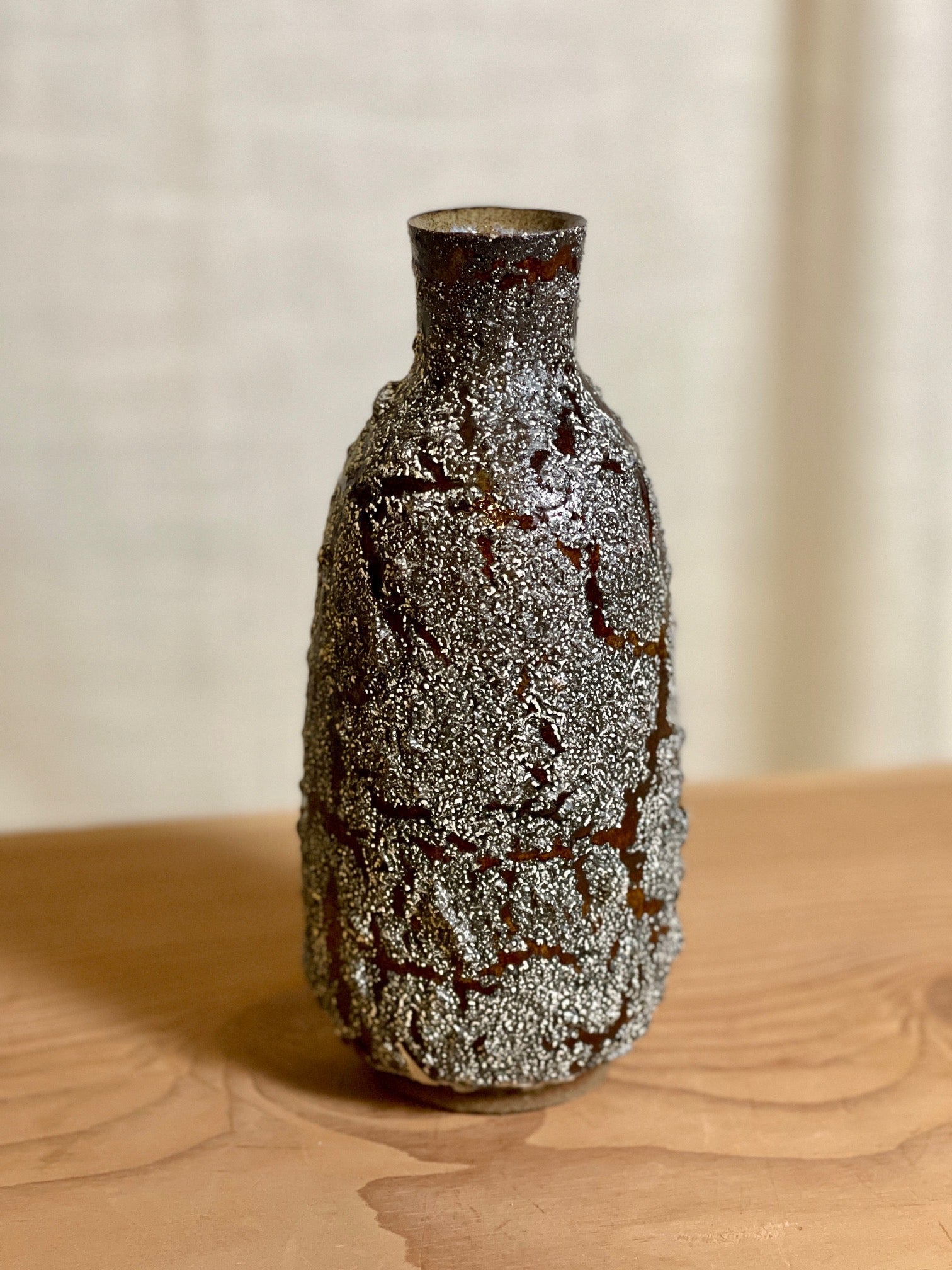 Denne særlige unika vase har en tekstureret, krakelleret overflade. Farven er lys sand fra et lag af meget groft ler fyldt med chamotte - deraf den grove overflade. Samtidig er der et underliggende lag af mørkt blankt glasur, der ses i krakelleringerne.